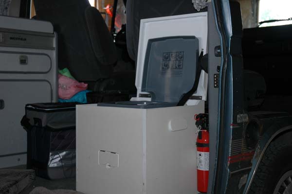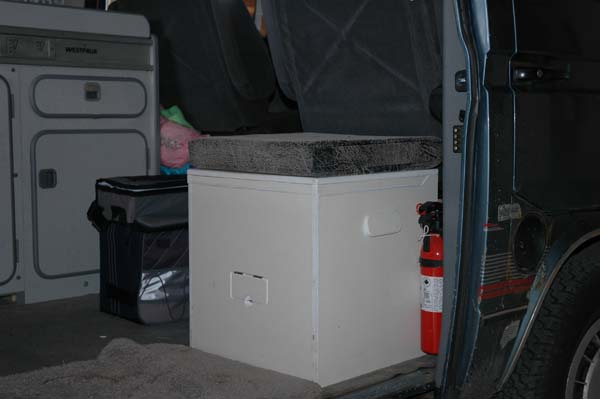 A plywood box was made to house the ViP 8 litre portapotty. The box was made tall enough to be a comfortable seat height when in use. It has a false bottom with an opening inside where chemicals can be stored. The box was made about 1 1/2" wider than the portapotty to allow it to be lifted out.