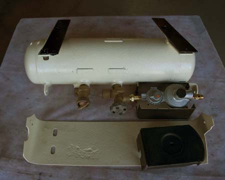 Secondhand propane tank blasted and painted and with new regulator.