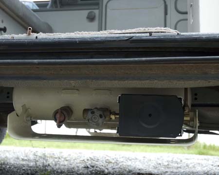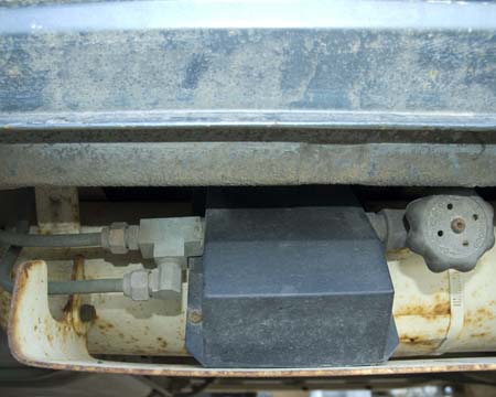 This required making new flat metal straps to mount the tank to. As well, the tank had to be moved 2 1/2" in from the outside edge of the van. The tank is bolted to the straps, then the strap bolted up under the van on the seat track bolts.