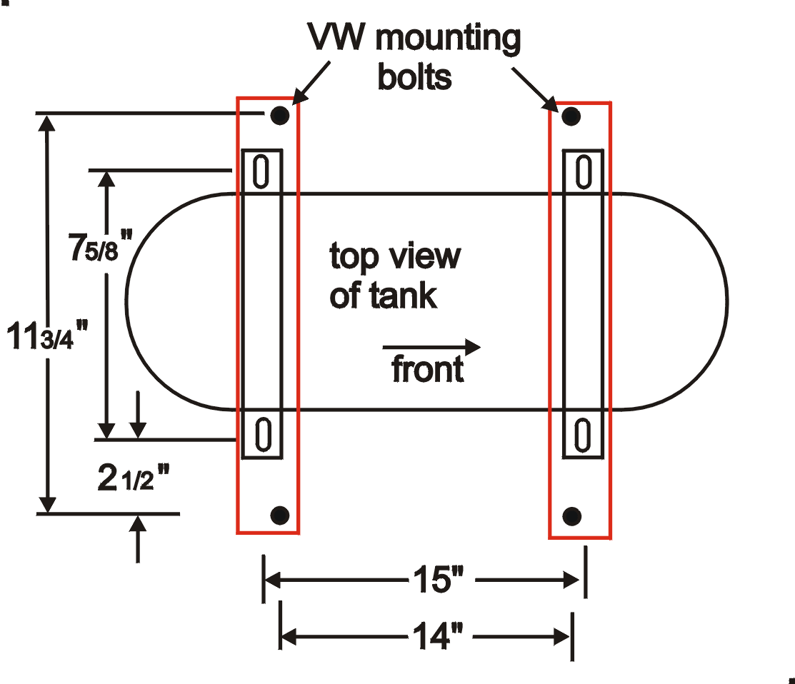 The second hand tank I bought turned out to be off an older VW, and was shorter. The mounting holes were 15" wide and 7 5/8" across. The mounting bolts on the van were 14" wide and 11 3/4" across.