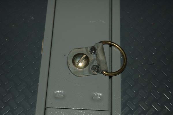 A flat strap of steel and a "D" ring form the tiedown anchor. It has a central spacer tube and washer underneath so the screw can be tightened but allow the tiedown to swivel.