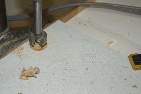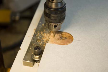 A 30mm diameter Forstner bit drills the rounded portion of the hinge recess. A stop on the drill press is set to drill to the correct depth.