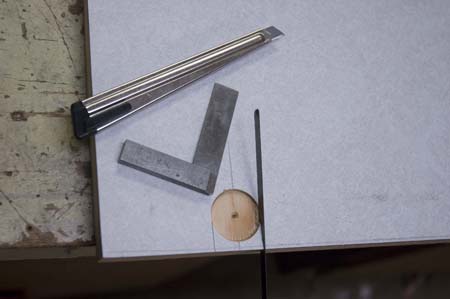 With an engineers square and a very sharp knife, the Formica TM is scored at the edges of the 30mm hole.