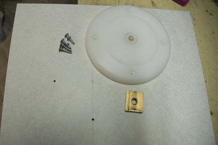 Rather than take the steel base plate off the original table, a new base plate was made from 3/4" nylon (another free scrap). The brass threaded piece is countersunk into the top of the nylon circle.