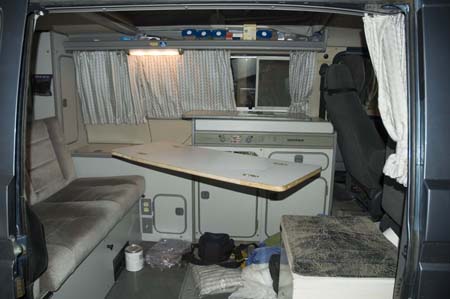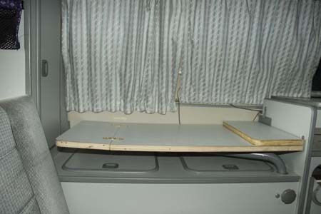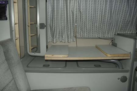 As an alternative, I cut a portion off the table. But that could leave a rather short table! There are also times when a longer table would be a benefit - but a longer table will not stow between the fridge cabinet and the wardrobe - unless it is modified somehow.