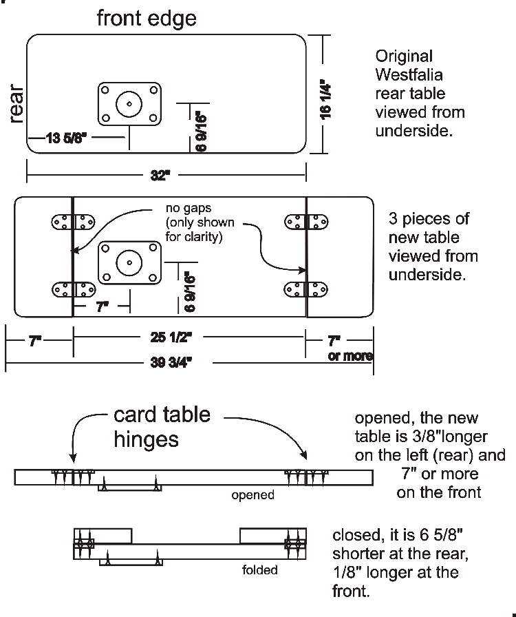 The top drawing shows the original table - 32" by 16 1/4" including the T-molding.